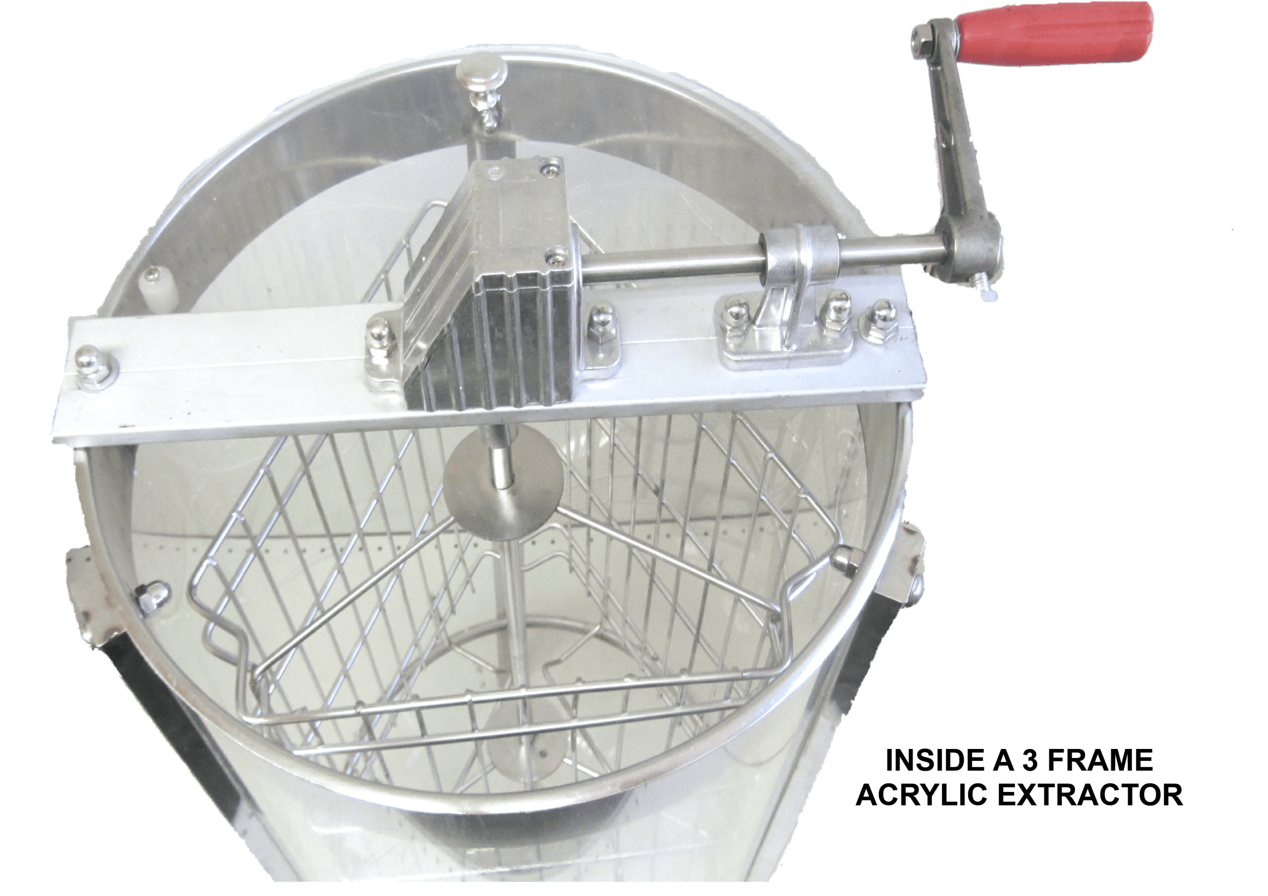 3 Frame Acrylic Extractor, has a stainless steel cage, legs, honey tap and frame.