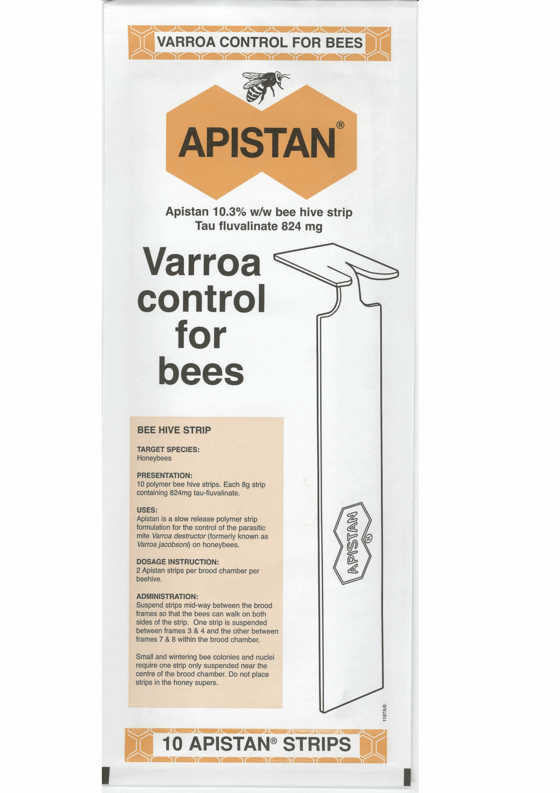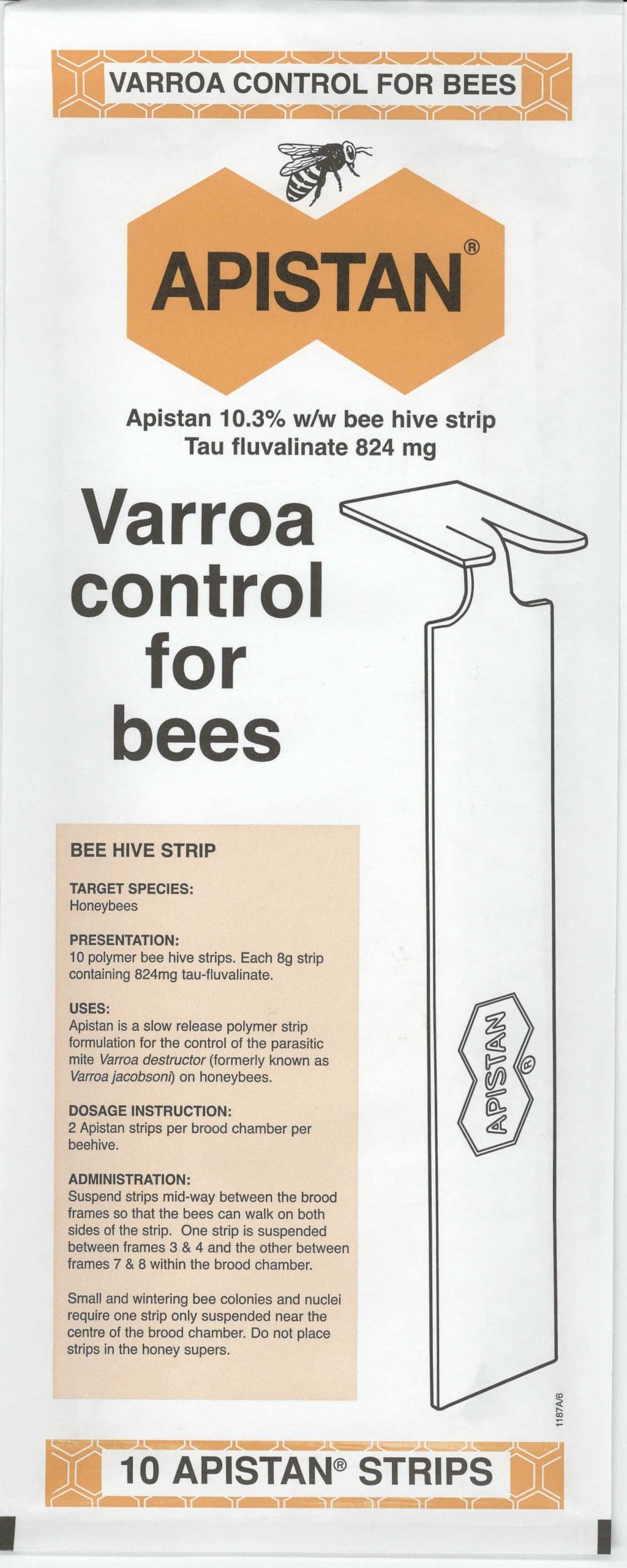 Treatment for varroa control, comes in a pack of 10 strips, 2 per hive, enough to treat 5 hives. Apistan® is probably the best and simplest defence against the varroa mite. Since the 1980s it has been the benchmark treatment and is now registered for use in more than 40 countries. It is very easy to apply – simply insert two strips in the brood box of a standard colony for six weeks at the end of the season.