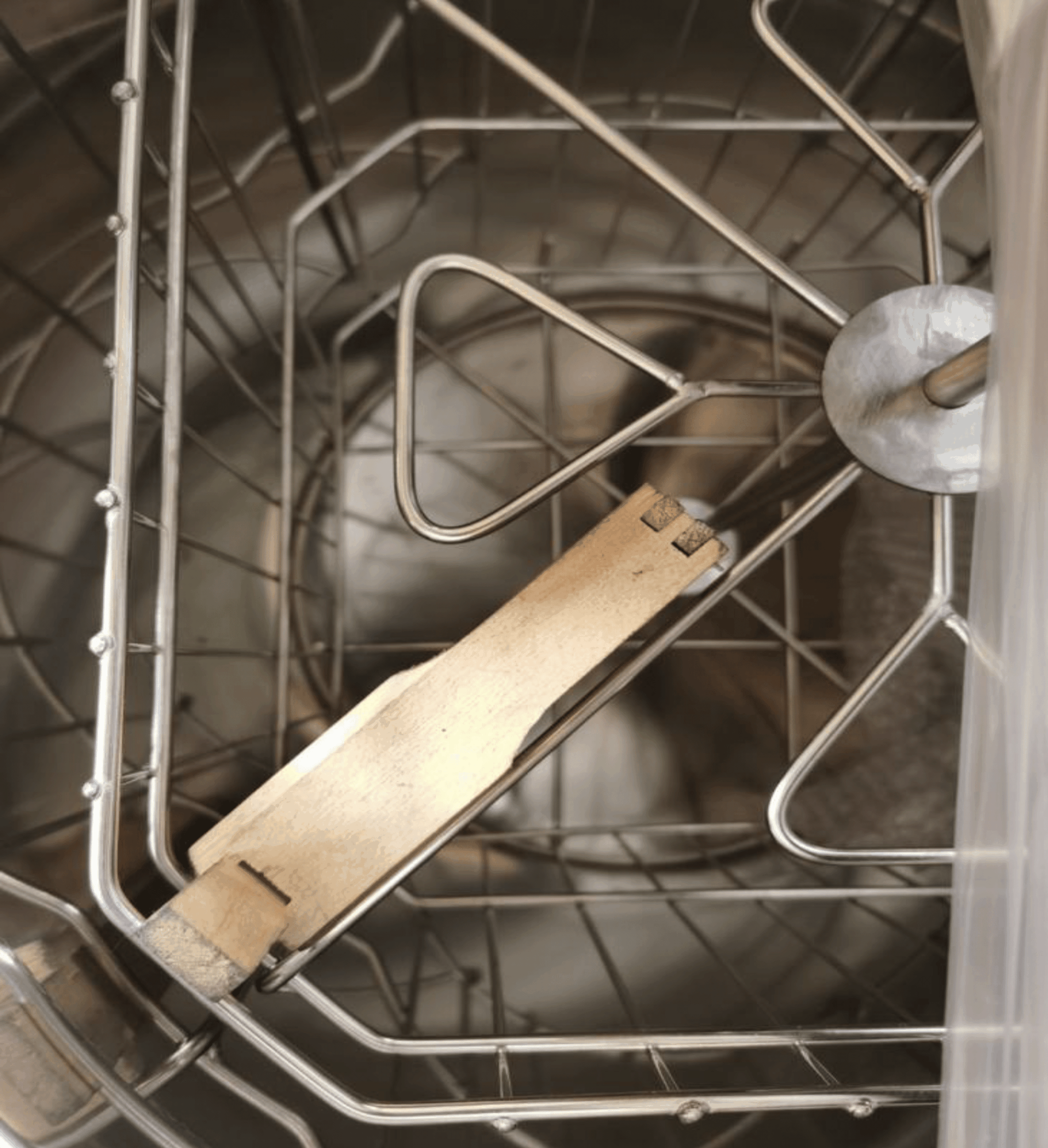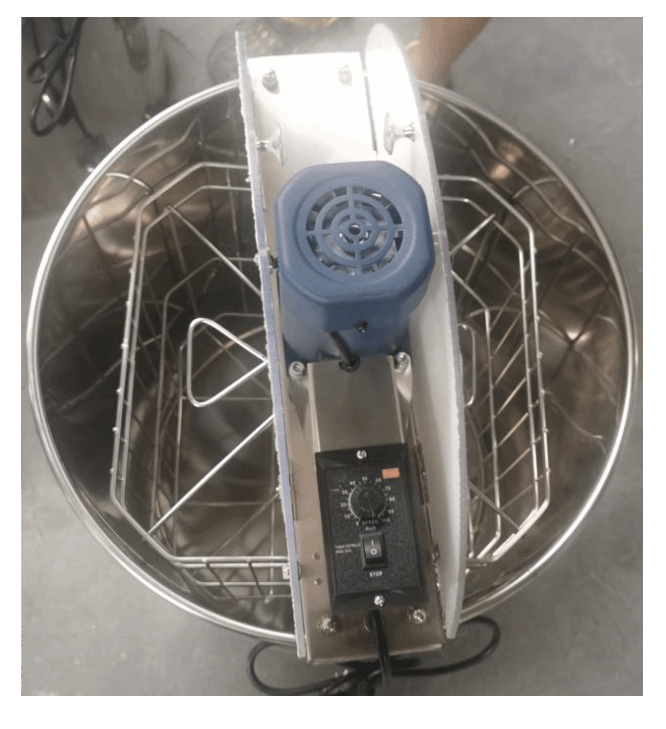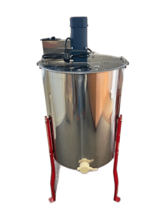 Budget 4 Frame Stainless Steel Tangential Extractor (Electric) with Speed Control, comes with legs and a Nylon (plastic) honey gate. There is 39cm from floor to bottom of tank, Will take BS Deep and BS Shallow Frames and BS Manley Shallow Frames. WILL NOT TAKE 14×12 FRAMES