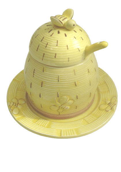 Delightful china honey pots with lid. The yellow version comes complete with saucer and spoon, approx 12cm high x 9cm wide. The white and pink pots are approx 11.5cm-12cm high x 9.5cm wide.