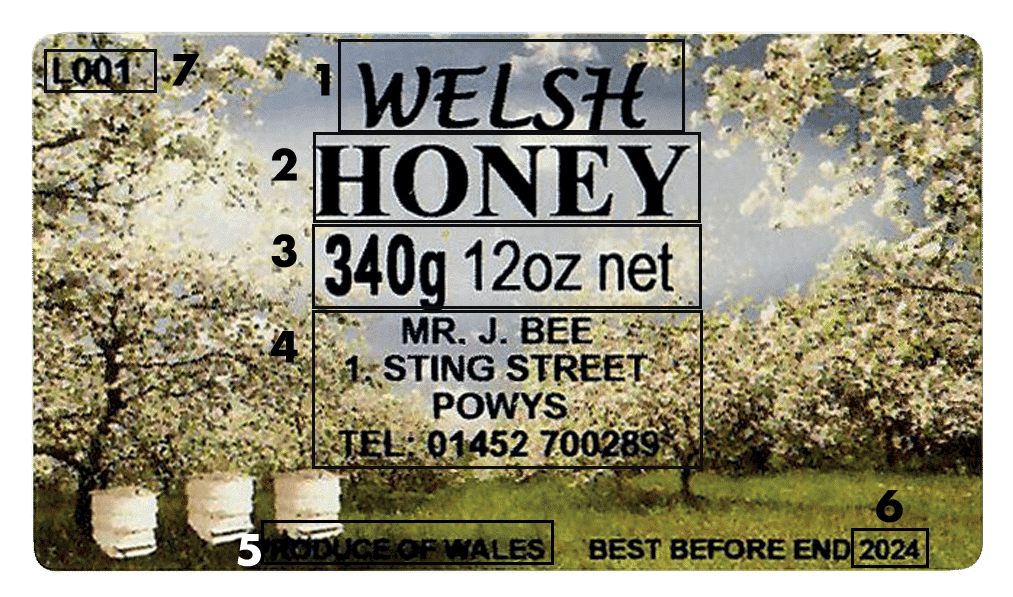 • Area 7 – Lot number – State whether they are the same number on every label or consecutive (ie., L001, L002, L003 etc.,.) Only numbers can be consecutive not letters. A Lot No is required if honey is being sold via a third party.