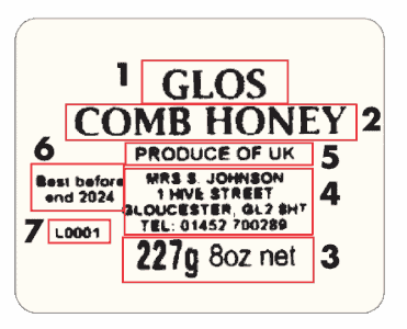 • Area 7 – Lot number – State whether they are the same number on every label or consecutive (ie., L001, L002, L003 etc.,.) Only numbers can be consecutive not letters. A Lot No is required if honey is being sold via a third party.